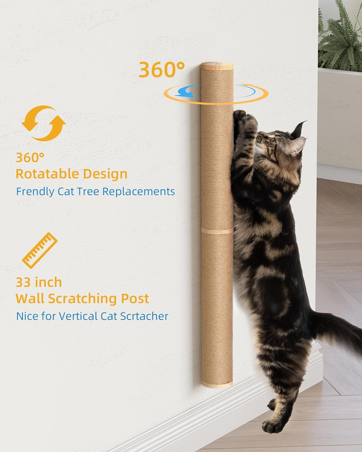 • Stretch and Scratch Away: This 34-inch tall, 3.35-inch diameter wall mounted cat scratching post is perfect for most (small, medium and large) cats to fully stretch and satisfy their natural climbing and scratching instincts