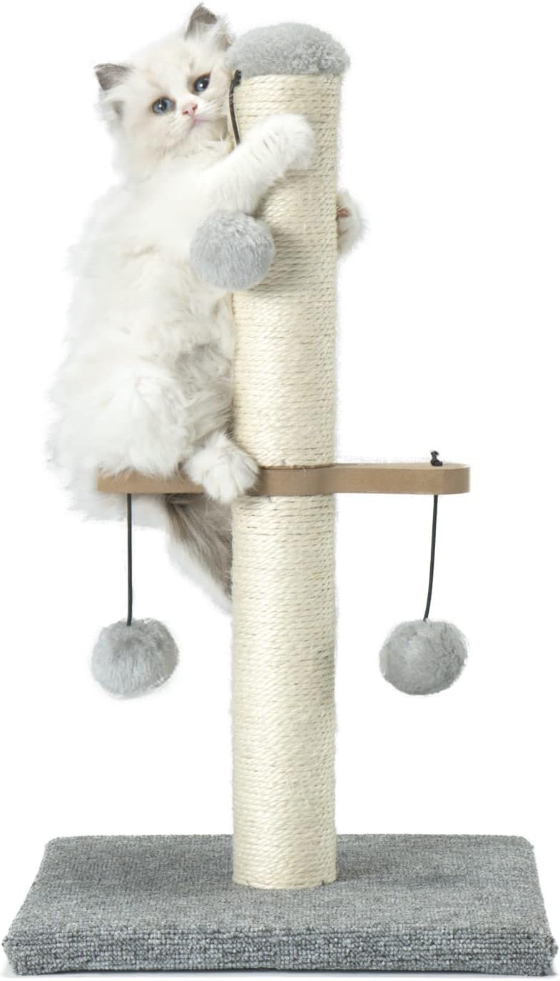 - Functional perfection??Sisal scratch post and three high hanging ball toys.Meet the cat’s needs for sharpening claw,patting and playing.
