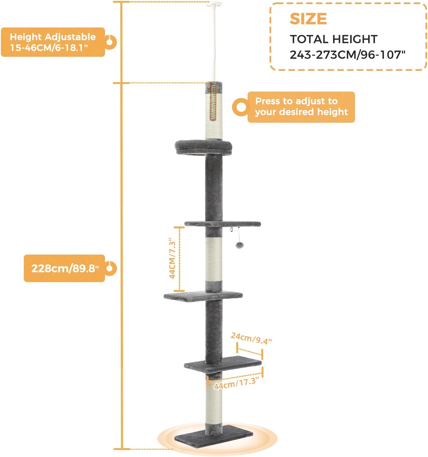 - Climbing Tree with Adjustable Height: The whole cat tree consists of 5 levels push-covered platforms, distance from every 2 platforms is 17.3 inches, the tension rod on the top can be adjusted to a preferred height from high to low??95-109 Inches?? accommodate room ceiling. Once the tension rod is compressed enough, your cats can challenge themselves climbing to the top and enjoy the view from above