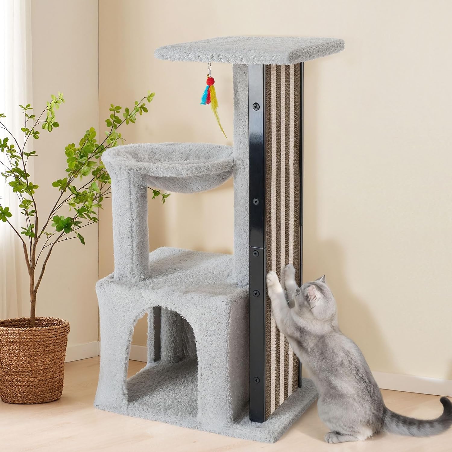 - 5-in-1 Kitty Fun Spot: This small cat tower combines a cozy cat condo, relaxing hammock, elevated perch, corrugated scratching board, and jingly feather toy! All in one space-saving unit for endless play